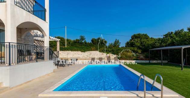 Auf einem Grundstück von 690 m2 befindet sich ein Fertighaus von 140 m2. Das Erdgeschoss verfügt über eine Küche, ein Esszimmer, ein Wohnzimmer, ein Schlafzimmer und ein Badezimmer. Im Obergeschoss befinden sich 3 Schlafzimmer, 2 Bäder und eine Terrasse mit herrlichem Blick auf den Pool und das Grün.