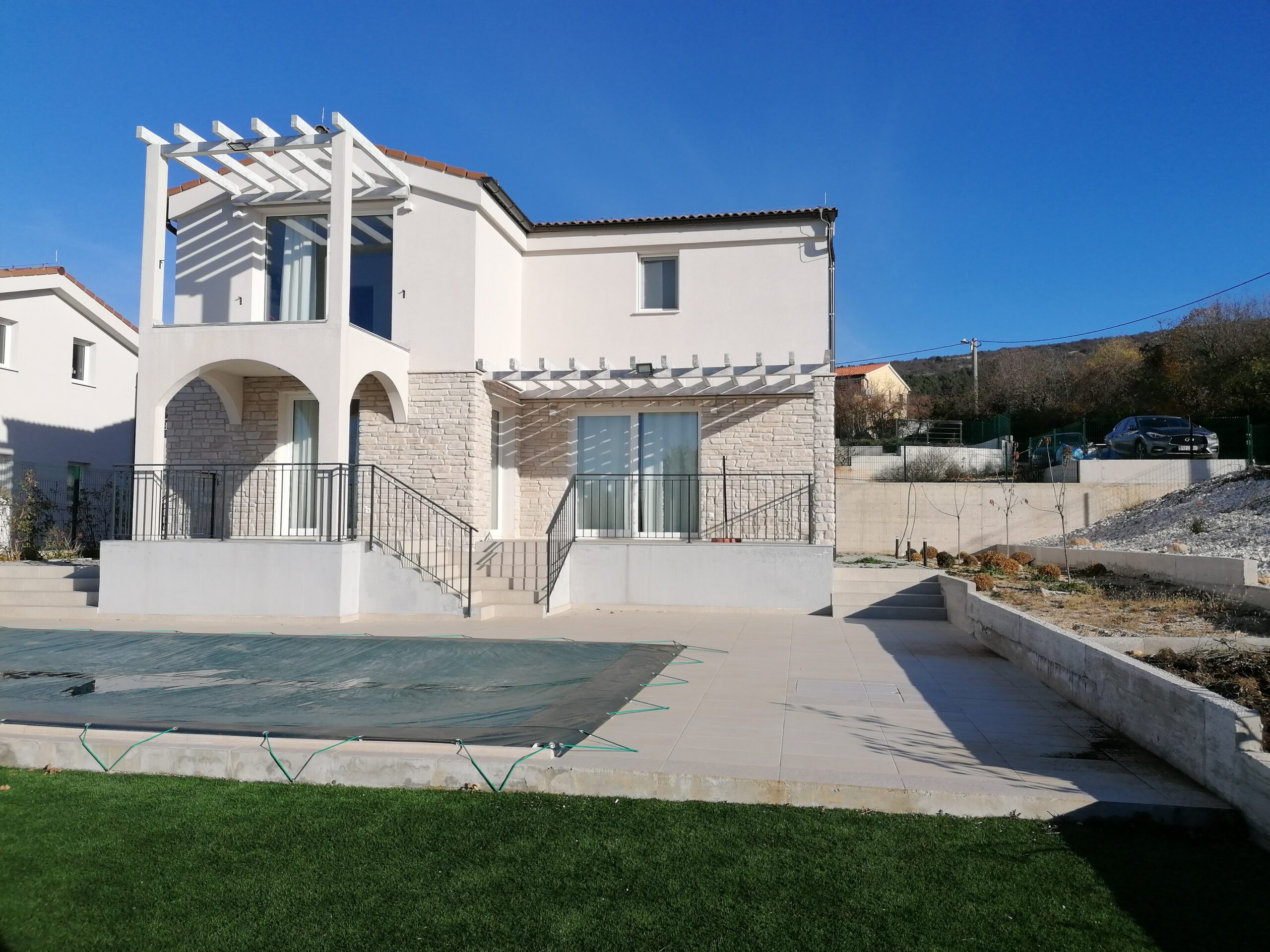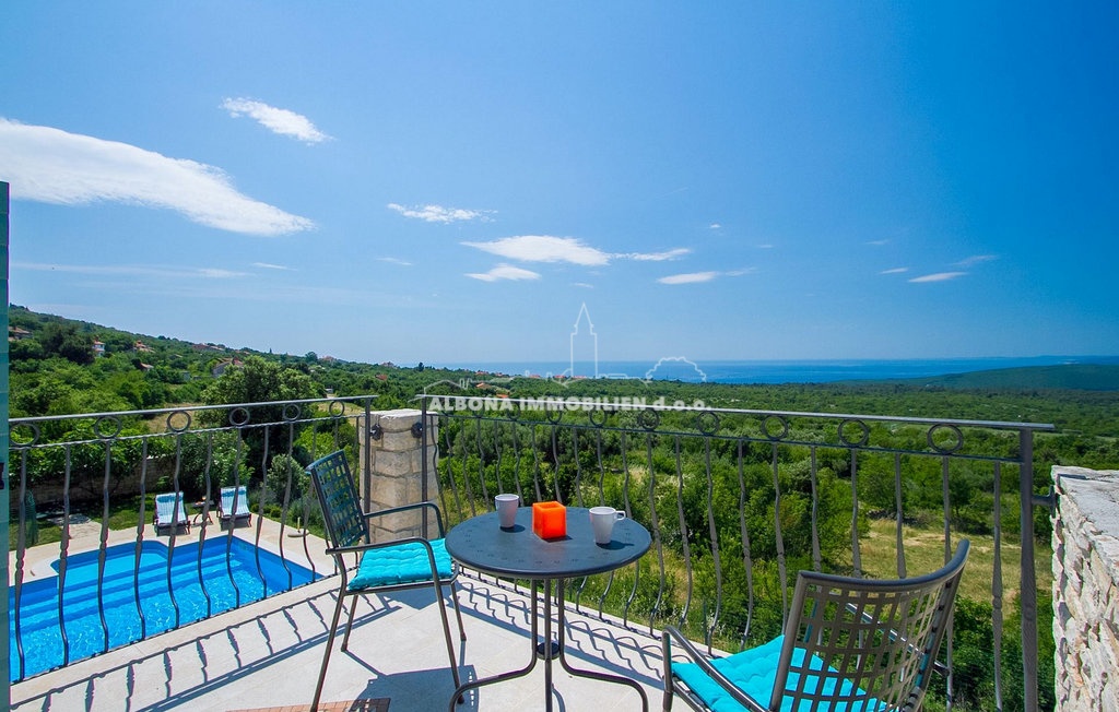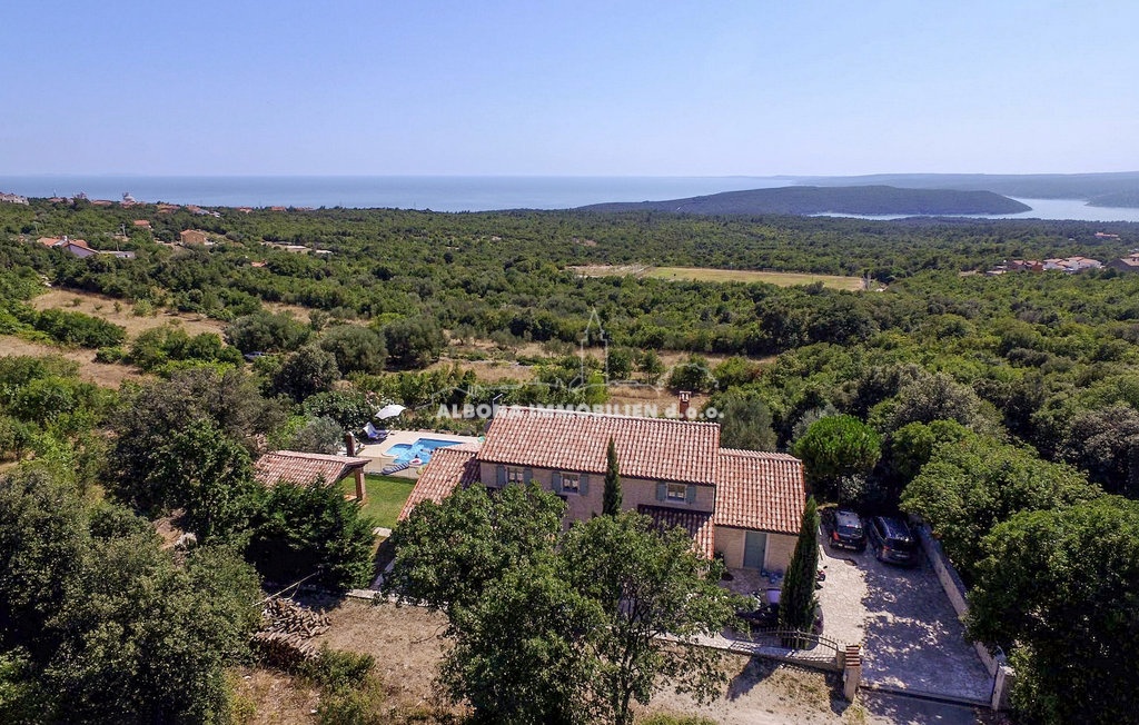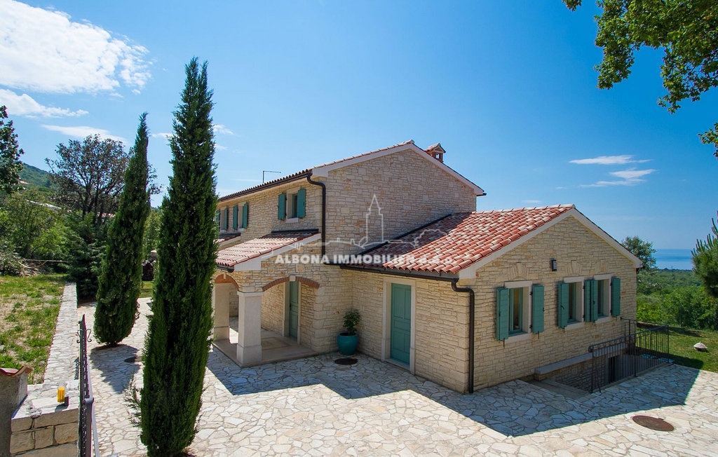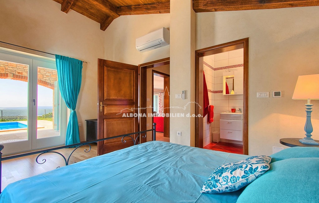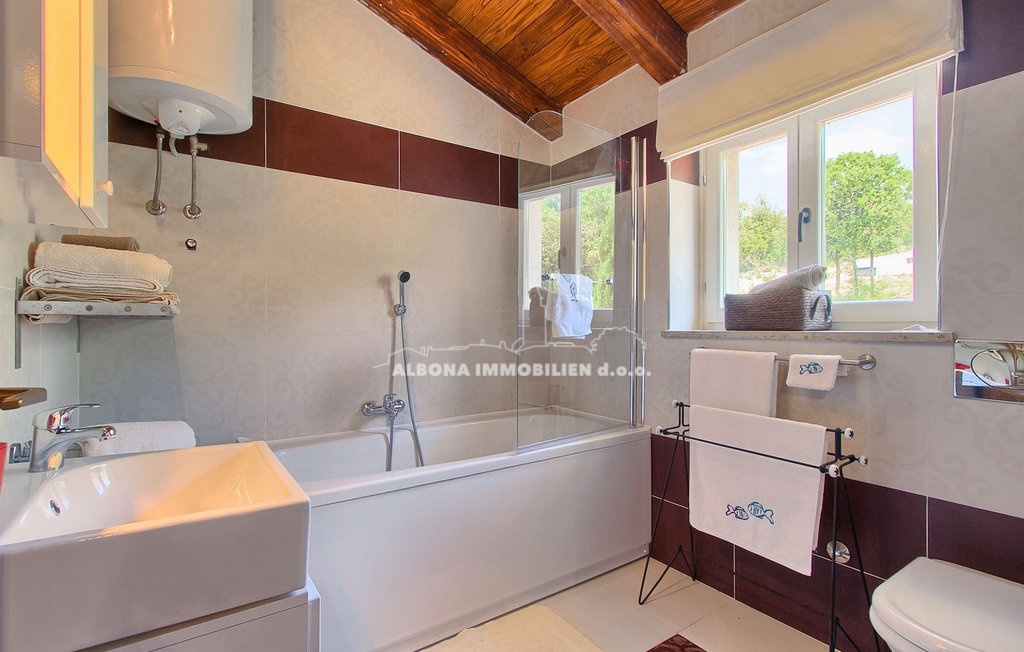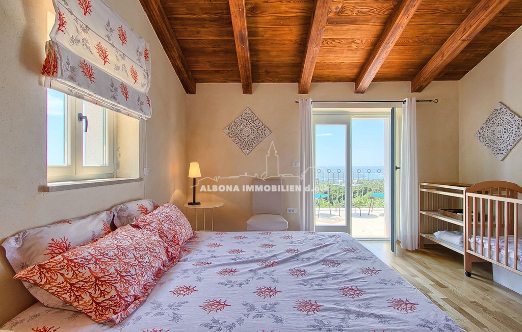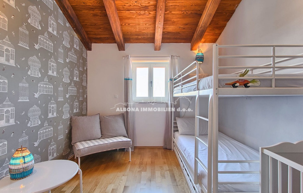 Im Obergeschoss befinden sich zwei Schlafzimmer mit eigenen Bädern, ein weiteres kleineres Kinderzimmer und eine Außenterrasse mit herrlichem Blick auf die Kvarner-Bucht.
