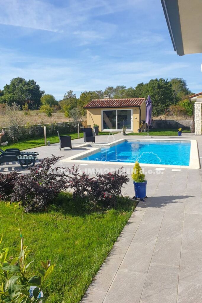 Na potpuno ograđenoj uređenoj okućnici nalaze se bazen, ljetna kuhinja sa ognjištem te parkiralište za automobile.