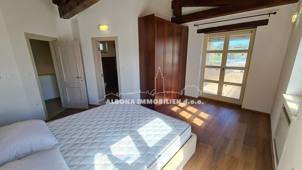 Unutarnjim stepenicama odlazi se do kata kuće gdje su smještene dvije spavaće sobe sa vlastitim kupaonama. Spavaće sobe imaju izlaz na terasu sa koje se pruža prekrasan pogled na prostran uređeni vrt s bazenom i prirodu koja ju okružuje.