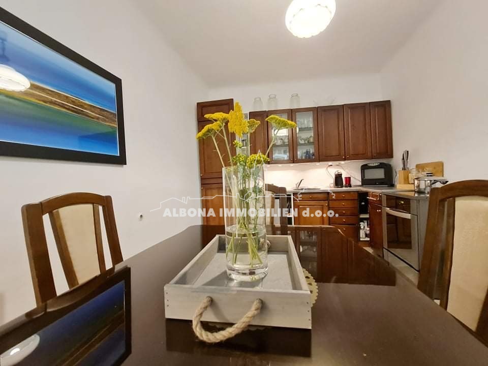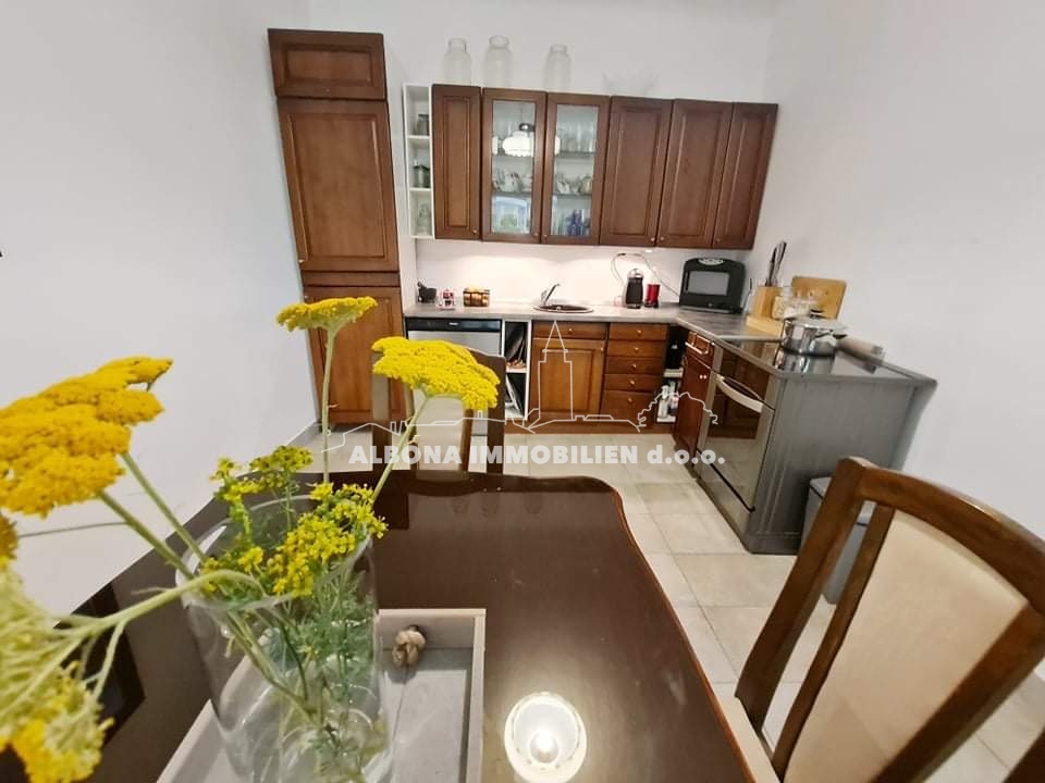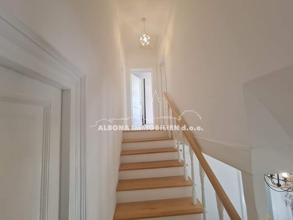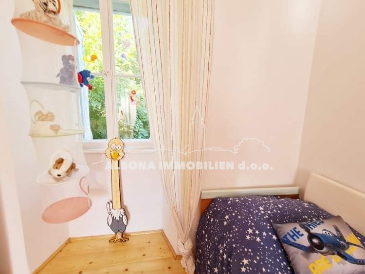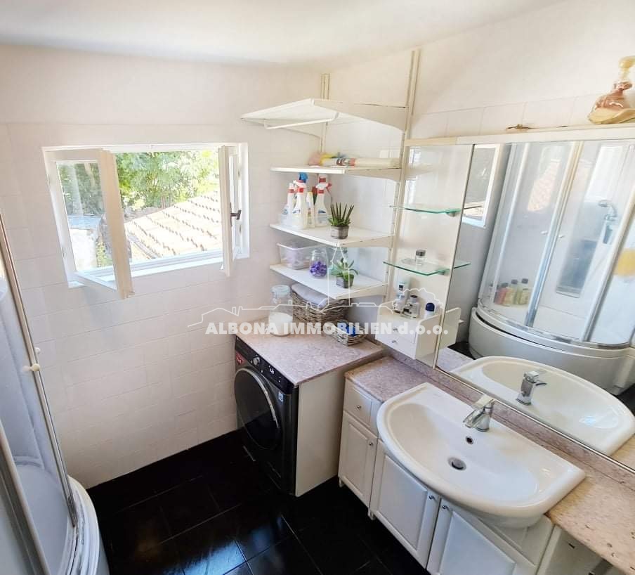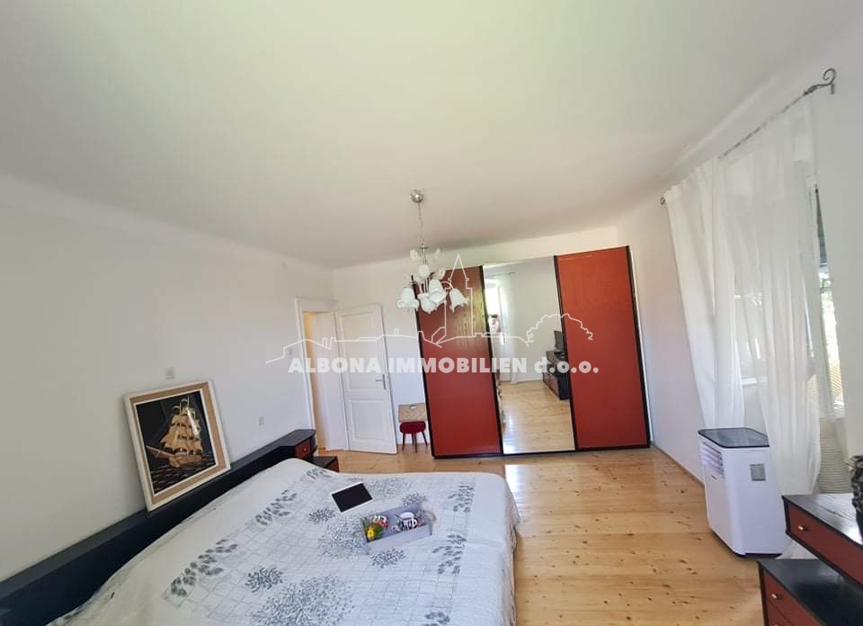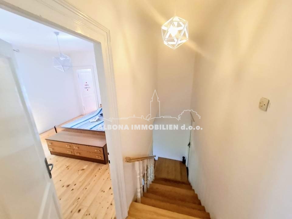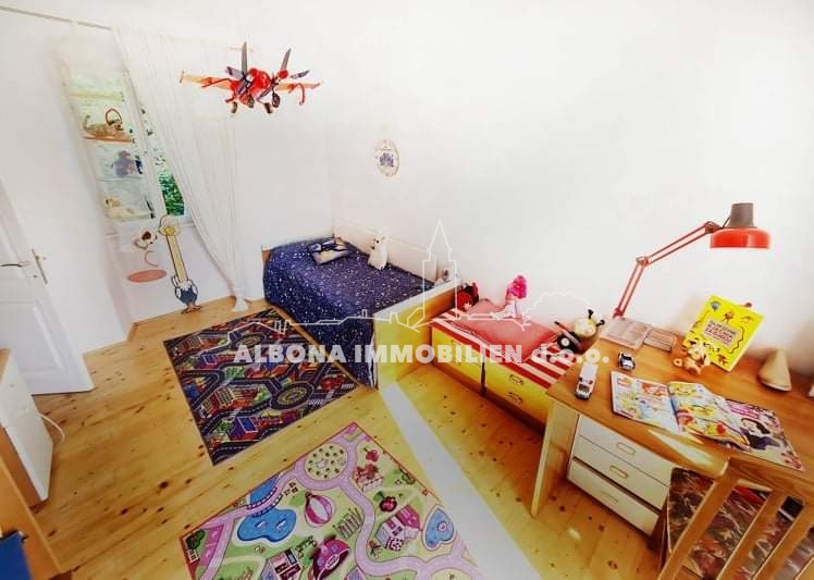 Kuća je samostojeća katnica površine 110m2. U prizemlju se nalaze ulazni hol, kuhinja, blagovaona, dnevni boravak i spremište. Drvene stepenice vode nas do međukata gdje se nalaze kupaona i wc. Na katu kuće nalaze se tri velike spavaće sobe od kojih je jedna preuređena u dječju sobu sa igraonicom.